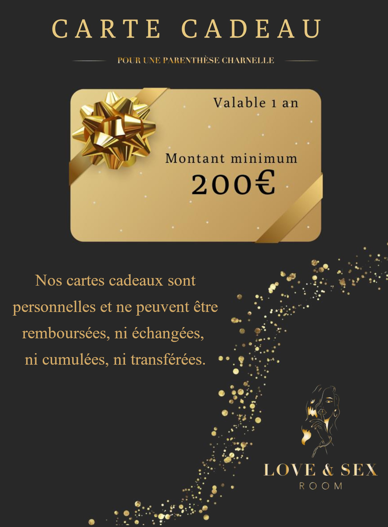 - La carte cadeau est valable uniquement pour les love room de Love & Sex Room.