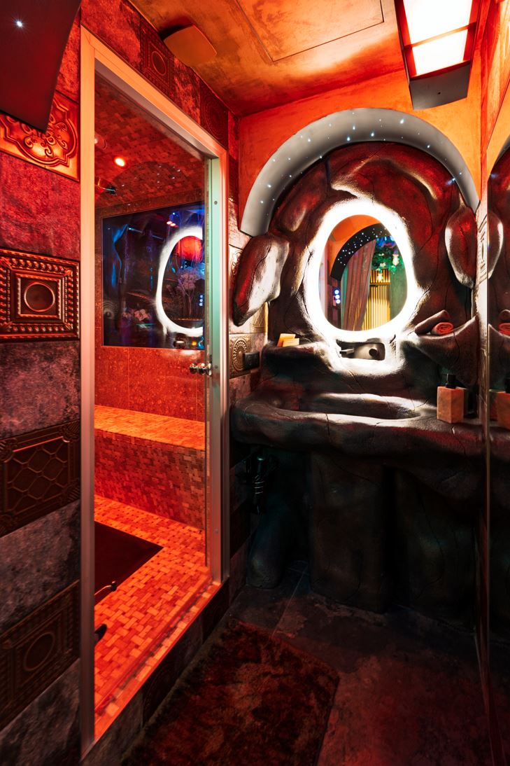 L’espace chambre, véritable cocon intime intégré au salon, a été pensé pour allier confort et sensualité. Il est doté d’un lit double en roche, entièrement conçu et façonné sur mesure, avec des miroirs subtilement intégrés à la structure et à l’environnement minéral. Cet aménagement unique, directement intégré au sol et à la roche des fantasmes, crée une ambiance feutrée et raffinée, idéale pour se retrouver dans un espace privatif d’exception.
