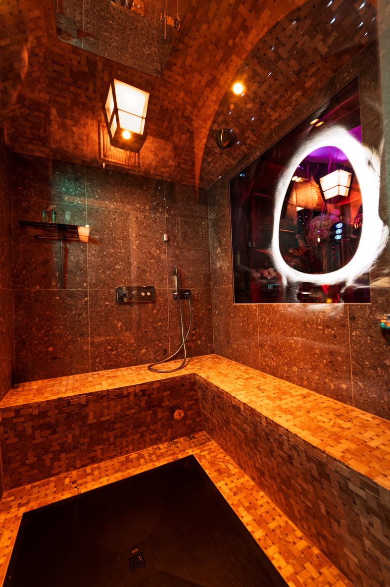 - Douche/Hammam 140 cm x 90cm avec ciel de pluie et banc d’assise